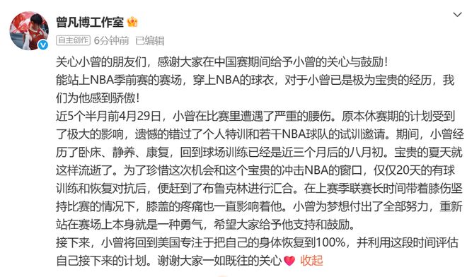 近5个半月前4月29日,小曾在比赛里遭遇了严重的腰伤。原本休赛期的计划受到了极大的影响,遗憾的错过了个人特训和若干NBA球队的试训邀请。期间,小曾经历了卧床、静养、康复,回到球场训练已经是近三个月后的八月初。宝贵的夏天就这样流逝了。为了珍惜这次机会和这个宝贵的冲击NBA的窗口,仅仅20天的有球训练和恢复对抗后,便赶到了布鲁克林进行汇合。在上赛季联赛长时间带着膝伤坚持比赛的情况下,膝盖的疼痛也一直影响着他。小曾为梦想付出了全部努力,重新站在赛场上本身就是一种勇气,希望大家给予他支持和鼓励。